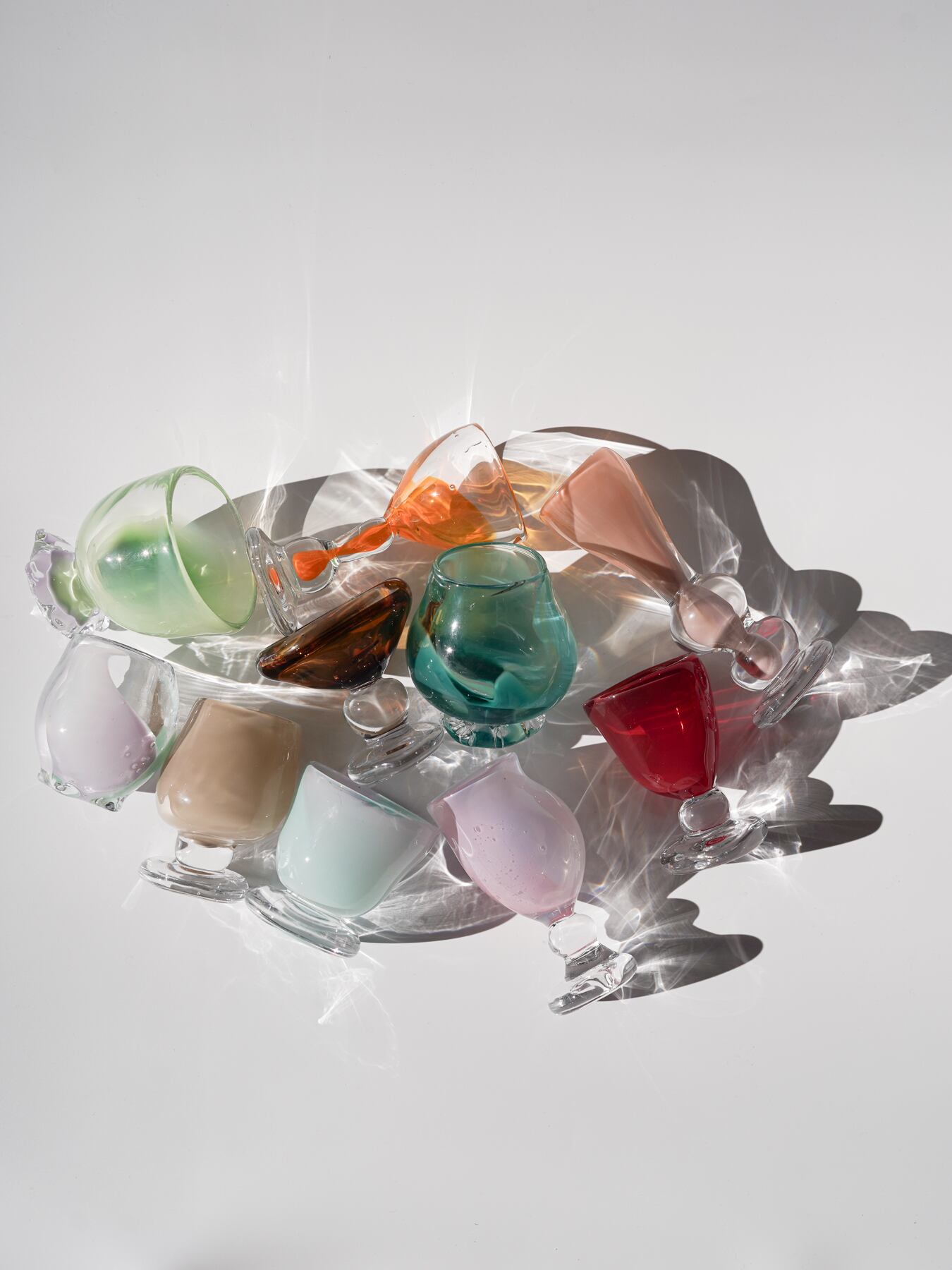 ガラスという素材の流動性と、作家自身の移ろいゆく思考の流れを重ね合わせて生まれた「ウニャっとした」オブジェたち。あえてラフスケッチを描かず、その時々のムードを大切に、熱くどろりとしたガラスと対話しながら形を導き出しています。