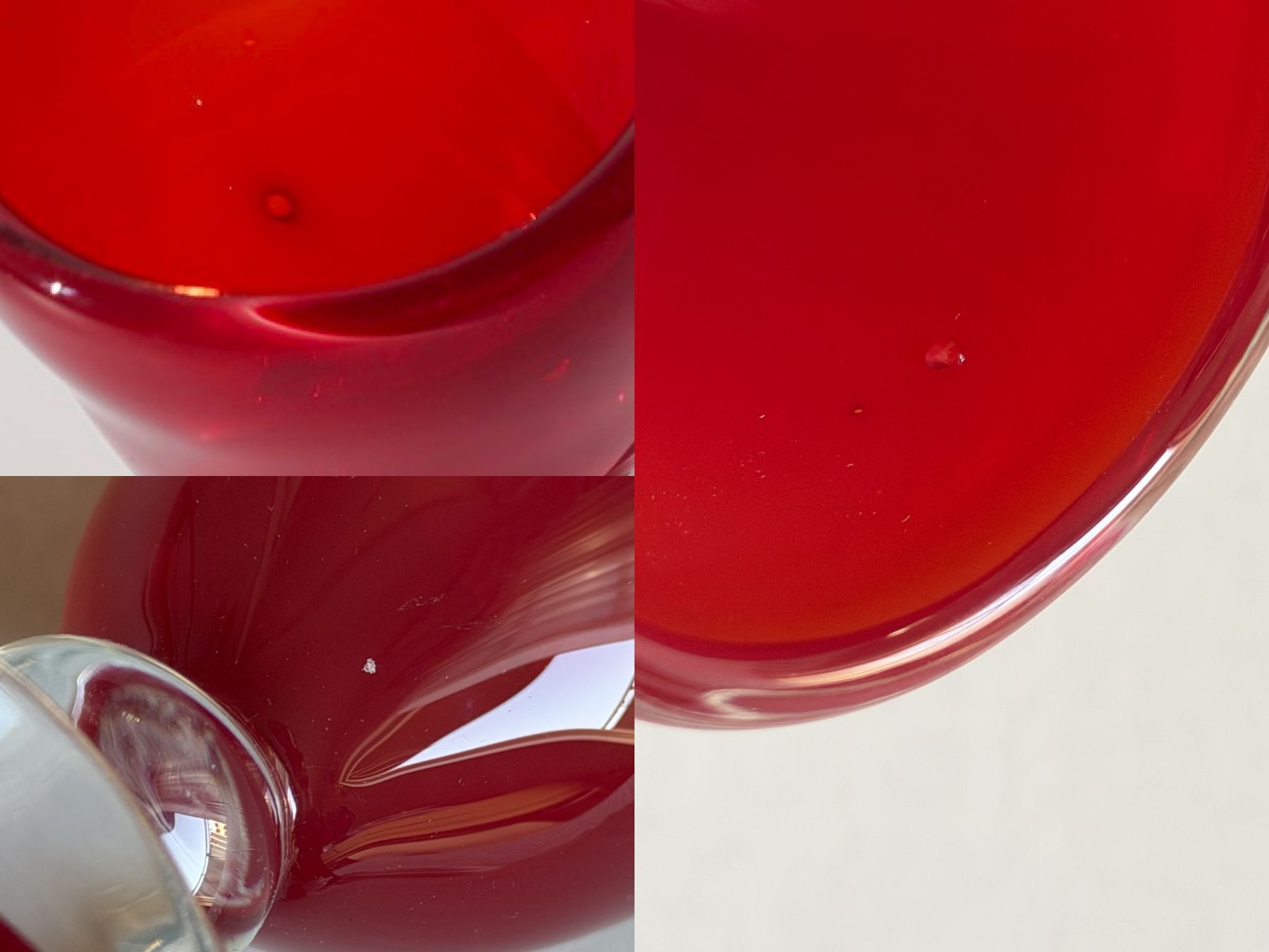 気泡部分が濃く見られたり、白い内包物、微細な傷、ガラスの小さな破片がついた箇所があります。